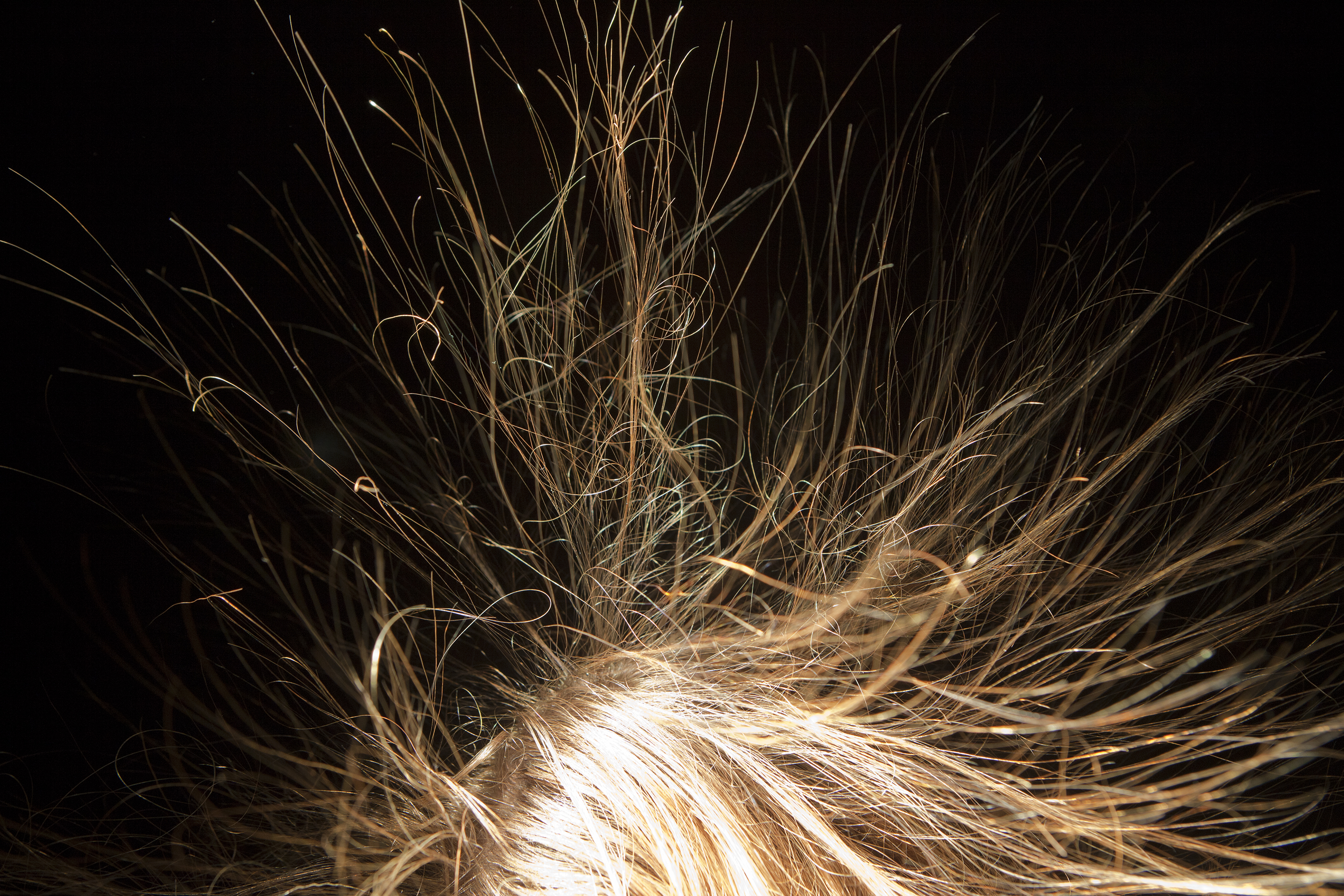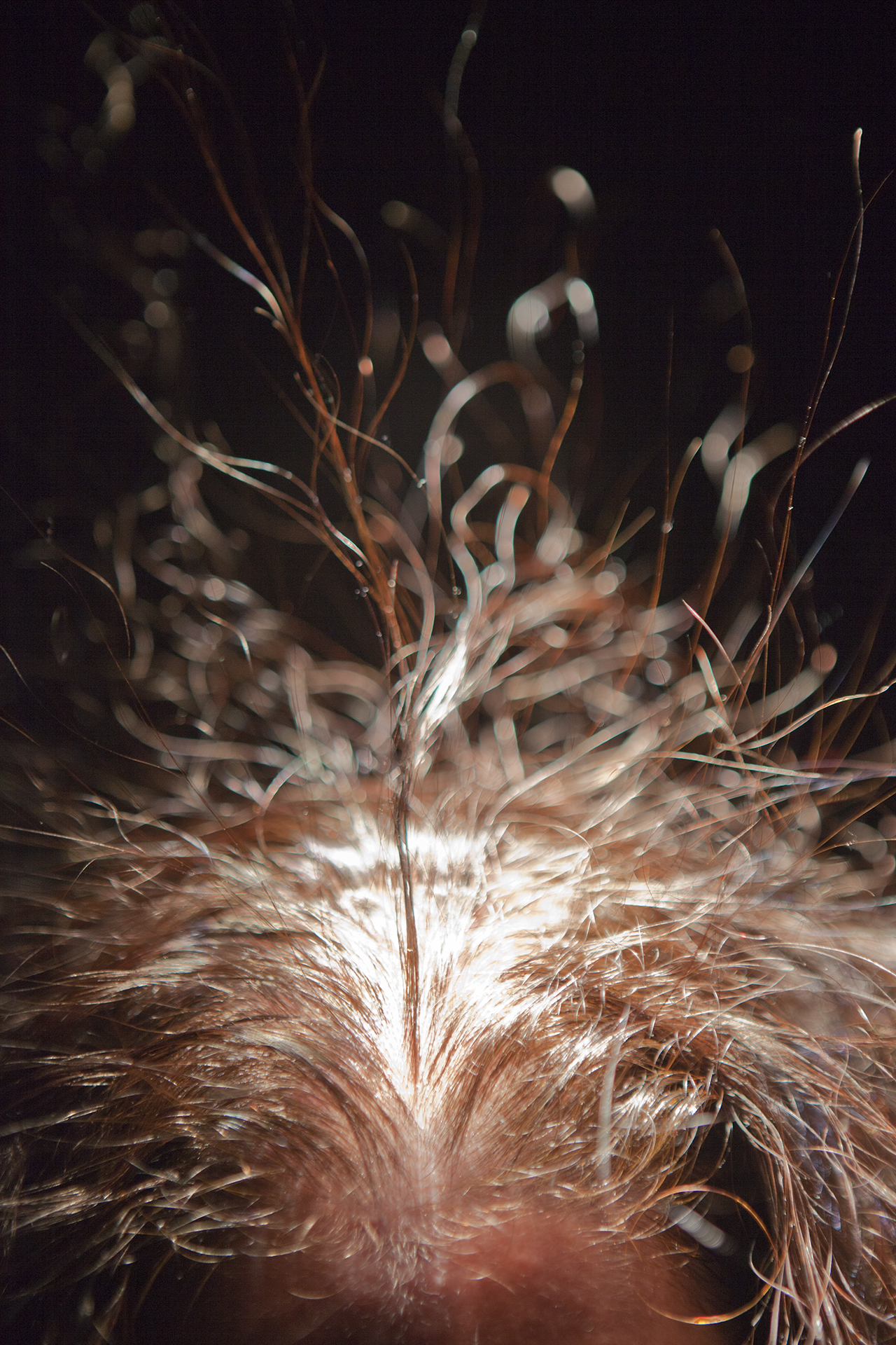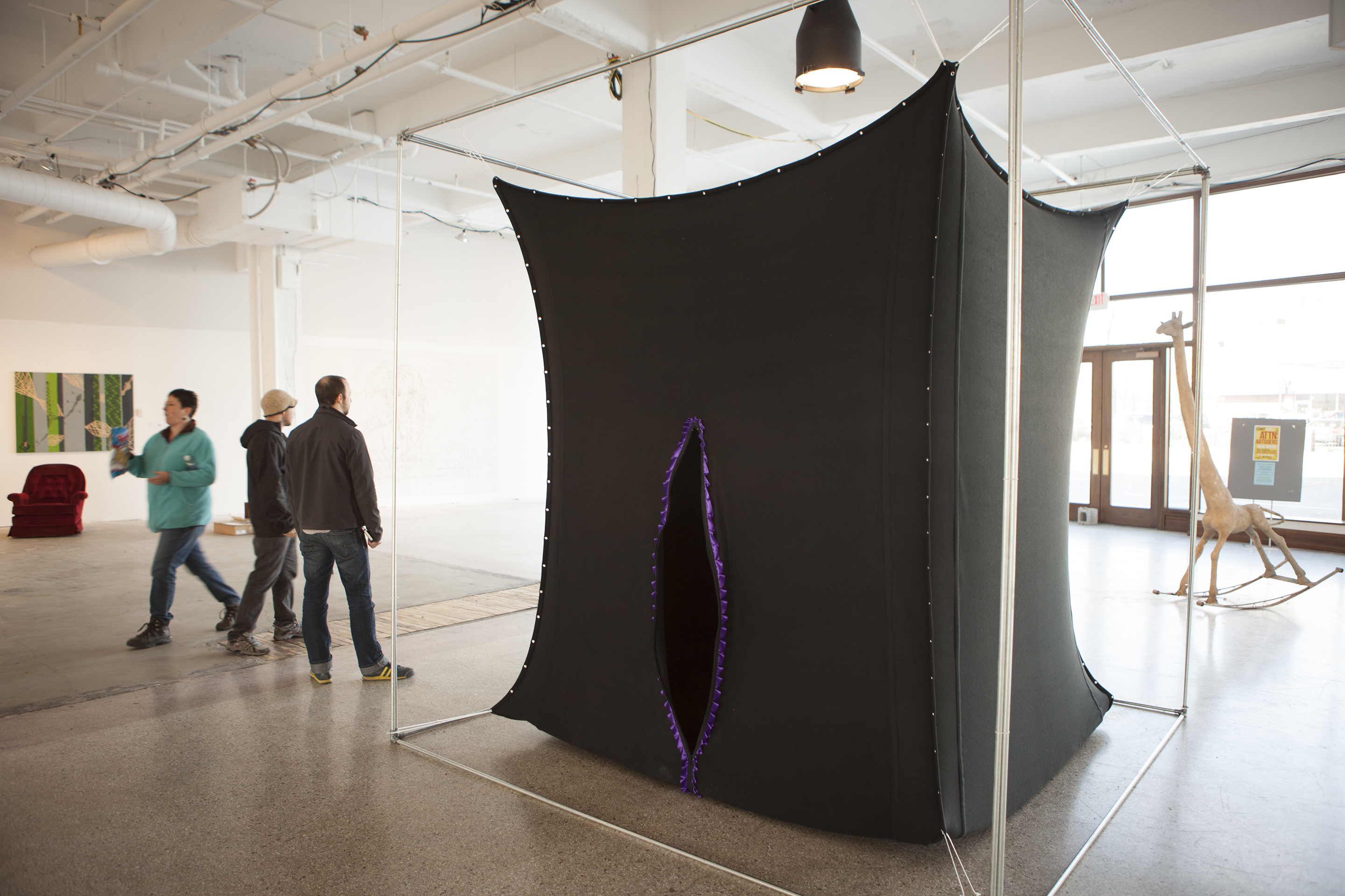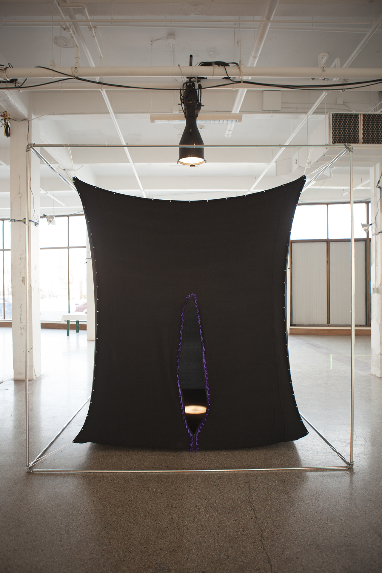 A soft cube-shaped envelope made of black fleece and 3″ foam suspended from electrical conduit with a zipper edged in funereal purple. Once inside the cube, participants perceive a strong shaft of light from above, illuminating the dust particles in the air, while a substantial buildup of static electricity makes their hair stand on end.